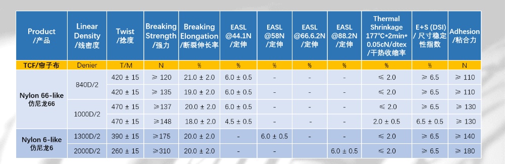 高適配斷裂強度、高斷裂伸長、低干熱收縮、高模量、幾乎不吸濕